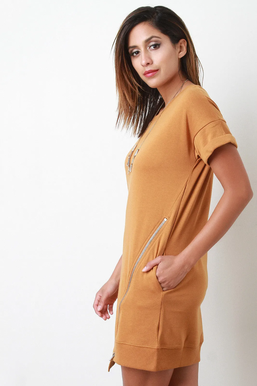 This  shift dress  features thick knit, round neckline, short sleeves, asymmetrical zipper accent, and two pockets. Accessories sold separately. Self: 65% Polyester, 35% Cotton. Contrast: 62% Polyester, 33% Rayon, 5% Spandex.